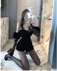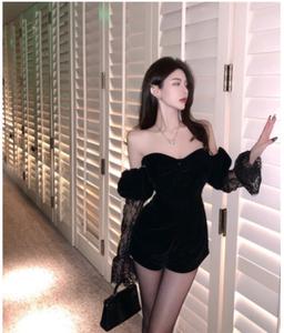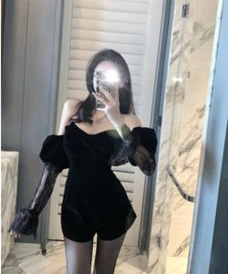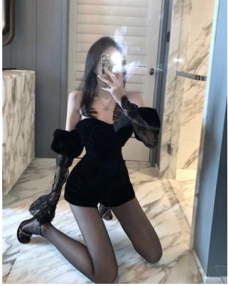 • Tên sản phẩm :2021 mùa thu thiết kế mới cảm giác một vai thắt nơ phụ nữ tính khí ren đen nhung phụ nữ jumpsuit
