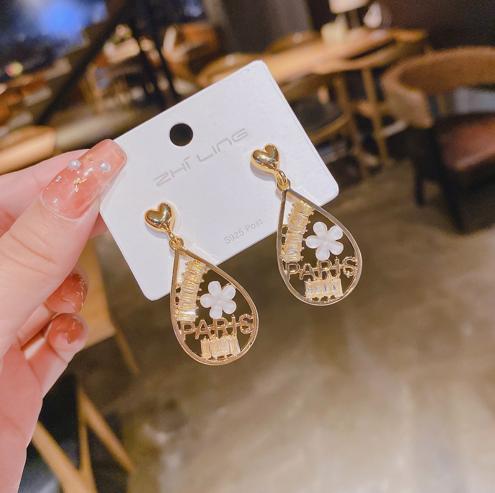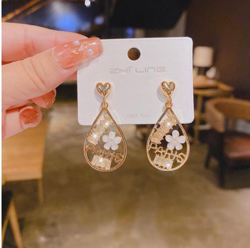 • 925 kim bạc hàn quốc Dongdaemun nhà thiết kế Paris zircon thả bông tai nữ mặt mỏng trang sức tai tình yêu