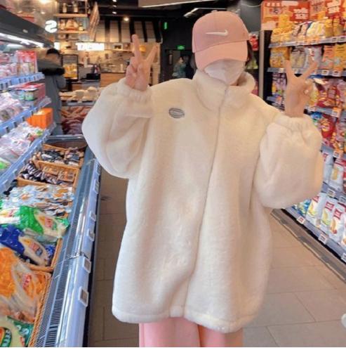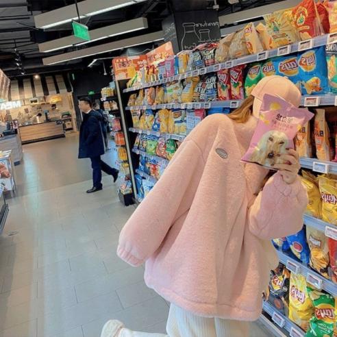 Tên sản phẩm : Áo khoác nhung cừu của phụ nữ áo khoác lông thú kích thước lớn thời trang lười biếng giả sang trọng cardigan sinh viên màu hồng và dịu dàng quần áo của phụ nữ trong thủy triều