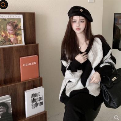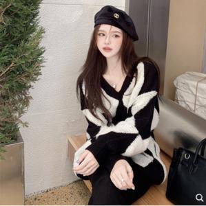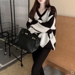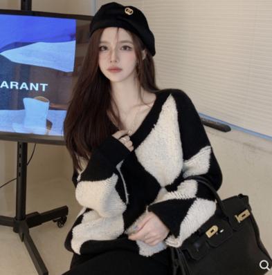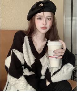 áo len kim cương pha màu đen trắng sợi len dày cổ chữ V phong cách hàn