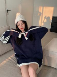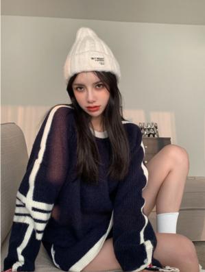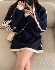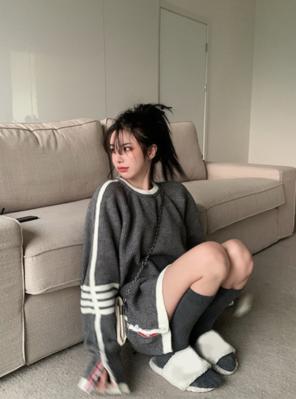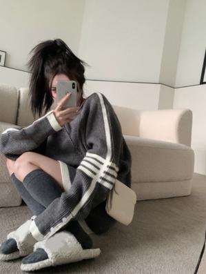 áo len nữ sọc xám áo len cổ tròn có xẻ tà ở gấu áo