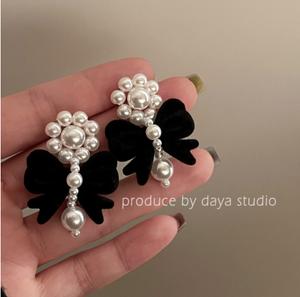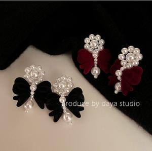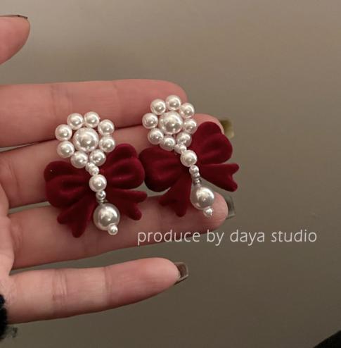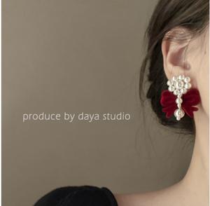 Bánh nhung đỏ Baroque cổ điển Pháp hoa tai ngọc trai nơ hoa tai nữ tính cao cấp