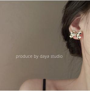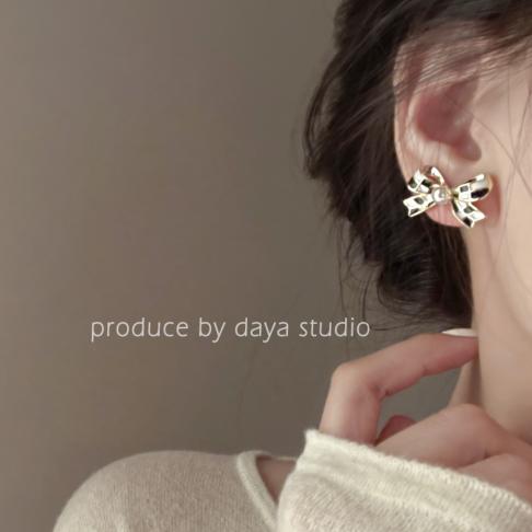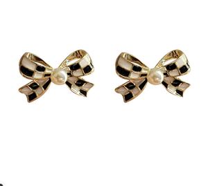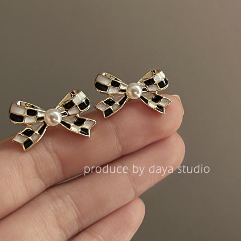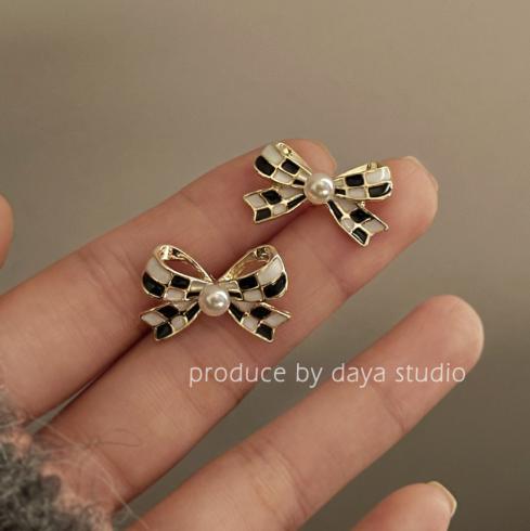 Bông tai hình giọt dầu kẻ caro bowknot ngọc trai nữ tinh tế cao cấp cảm giác thiết kế thích hợp bông tai cổ điển
