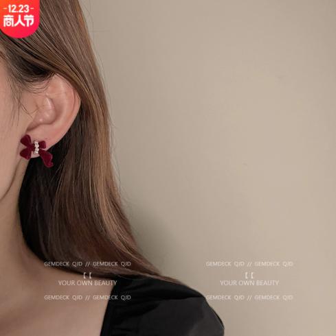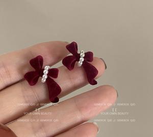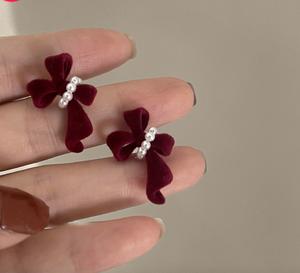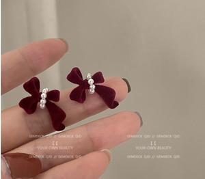 Bông tai ngọc trai nơ nhung đỏ tía mùa thu / đông năm 2021