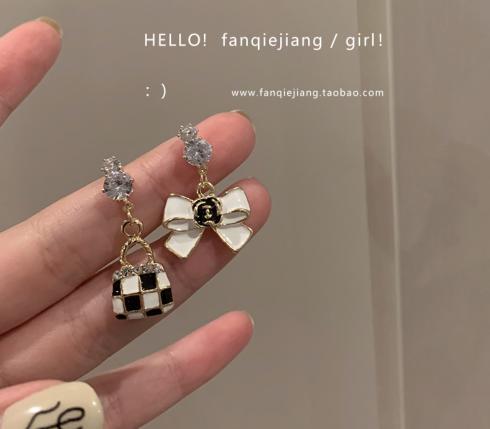 Bowknot kẻ caro túi bất đối xứng bông tai hoa tai phụ nữ ánh sáng sang trọng cao cấp cảm giác cá tính thời trang thích hợp bông tai