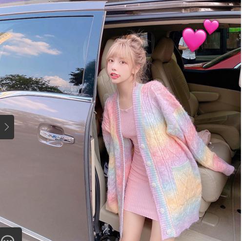 2021 mới áo len thu đông áo len cardigan của phụ nữ áo khoác sọc cầu vồng sinh viên áo len dệt kim rộng rãi lười biếng