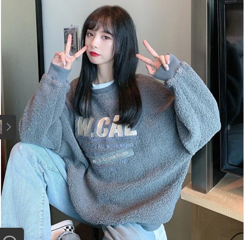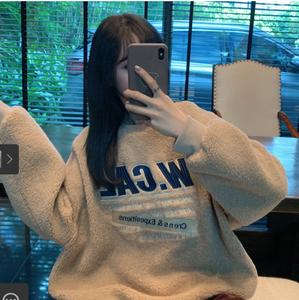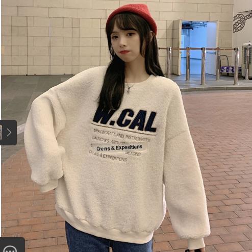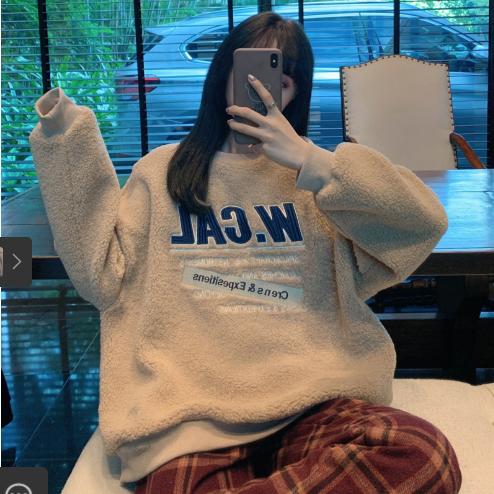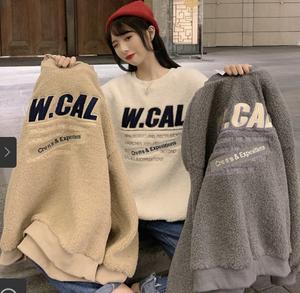 Áo nỉ giả lông cừu với dáng rộng dãi với chữ được thuê trên áo