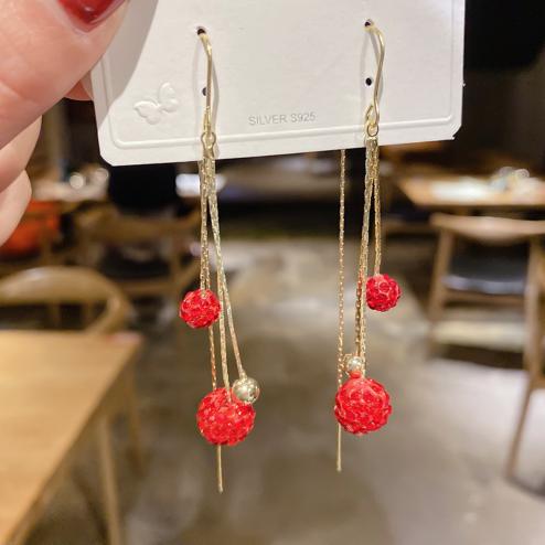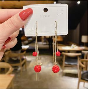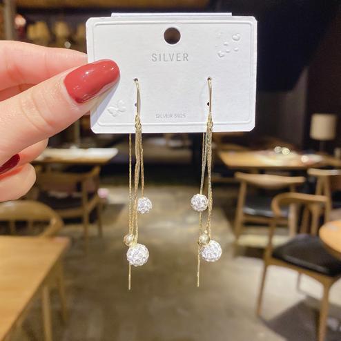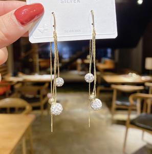 Bông tai hàn quốc vơi tua dài có những quả cầu tron đính đá sáng lấp lánh