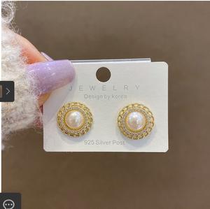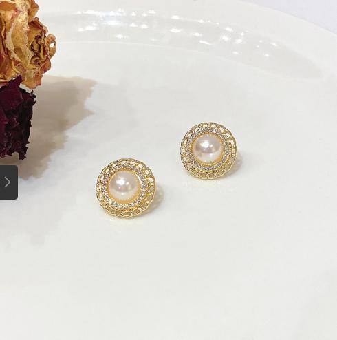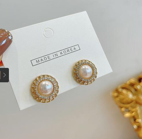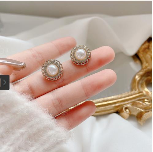 Bông tai ngọc trai tròn đính đá quanh viên ngọc trai làm sáng nổi bật viên ngọc trai và làm sáng khuôn mặt