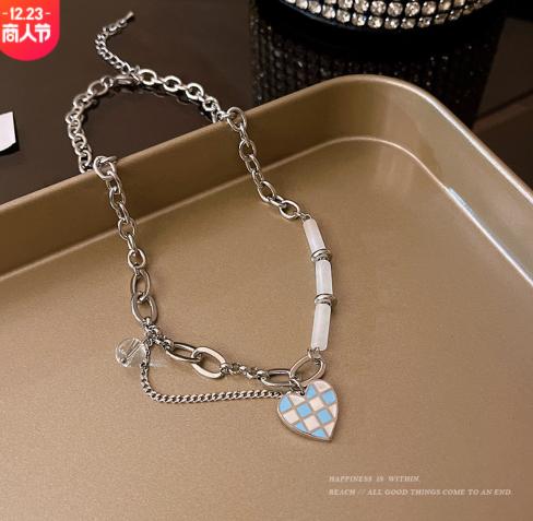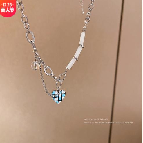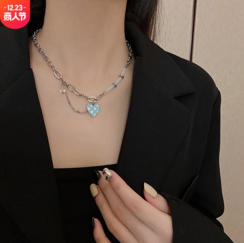 Hip-hop thiết kế thích hợp vòng cổ bằng thép titan nữ màu xanh tình yêu kẻ caro mặt dây chuyền lưới thủy triều đỏ Khóa gió lạnh Chuỗi xương