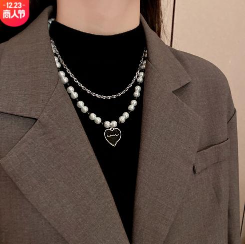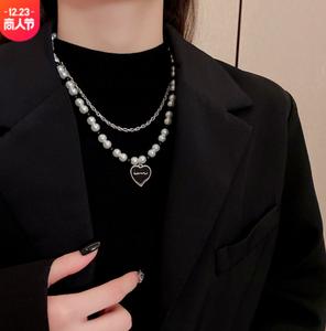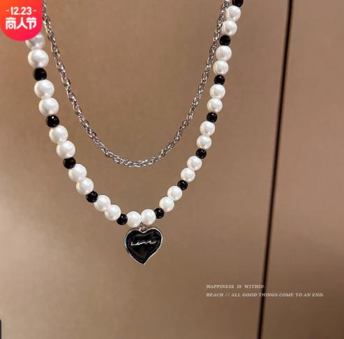 • Mặt dây chuyền tình yêu màu đen châu Âu và Mỹ thiết kế ngách vòng cổ bằng thép titan nữ đôi ngọc trai tính khí ròng thủy triều đỏ chuỗi xương đòn