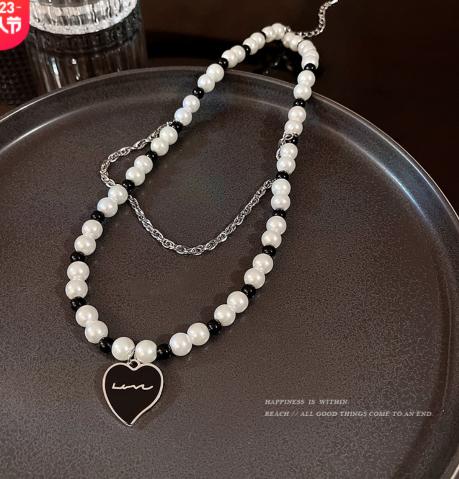 Mặt dây chuyền tình yêu màu đen châu Âu và Mỹ thiết kế ngách vòng cổ bằng thép titan nữ đôi ngọc trai tính khí ròng thủy triều đỏ chuỗi xương đòn