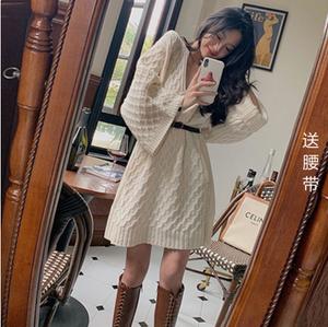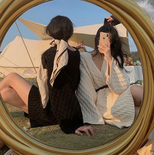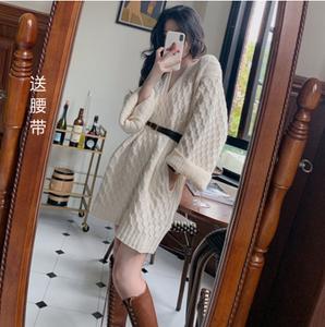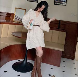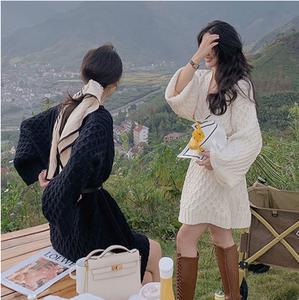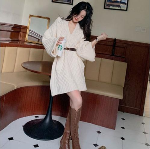 Tên sản phẩm : Mùa thu đông 2021 mô hình nhẹ nhàng và lười biếng gió lỏng mặc áo len dài cổ chữ v trung dài váy len phụ nữ