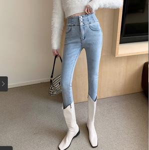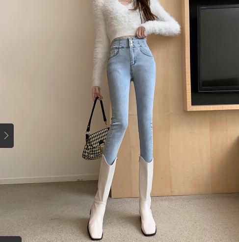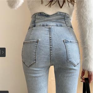• Quần jean nữ lưng cao co giãn mùa xuân 2021 lưng chéo lưng mới mặc bó sát chân và quần tây mỏng