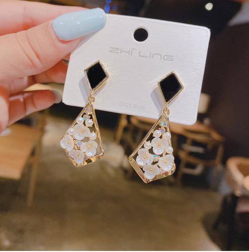 • S925 kim bạc Hàn Quốc Dongdaemun hoa tai kim cương khảm hoa hình học tính khí ròng màu đỏ in thiết kế hoa tai nữ