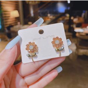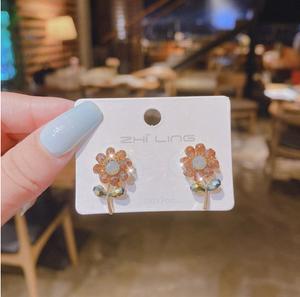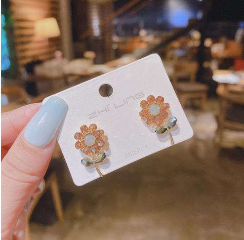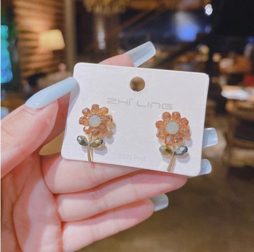 • s925 kim bạc sterling Hàn Quốc Hoa tai đi làm Dongdaemun hoa tai pha lê cánh hoa nữ tính khí đơn giản nữ hoa tai lưới màu đỏ
