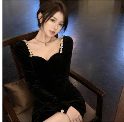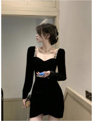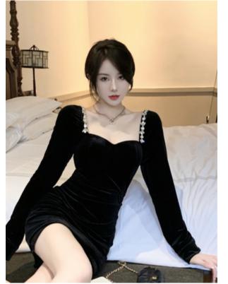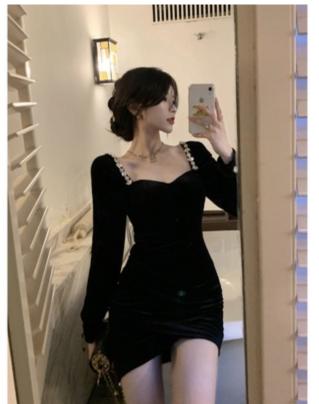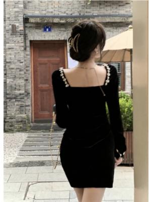 Váy cao cấp mùa thu 2021 với thiết kế của pháp với cổ vuông được đính đá