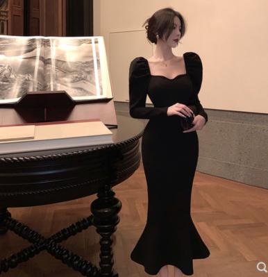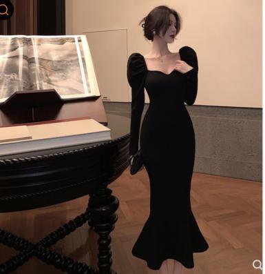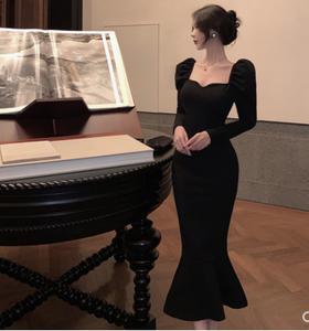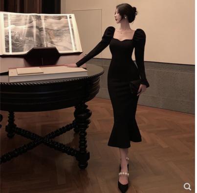 Váy dài tay đen mua thu đông phong cách của pháp