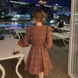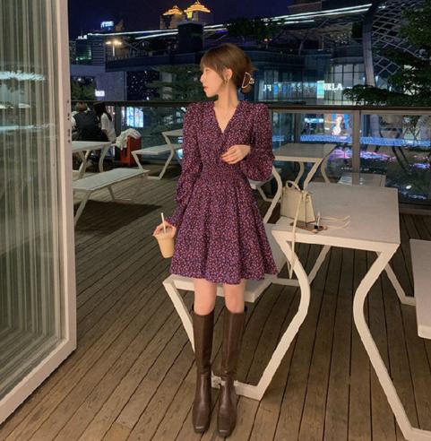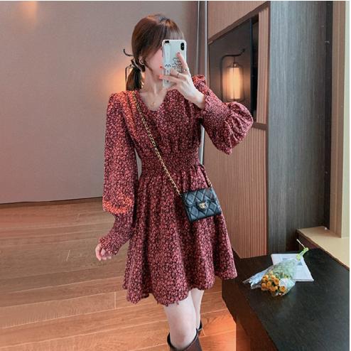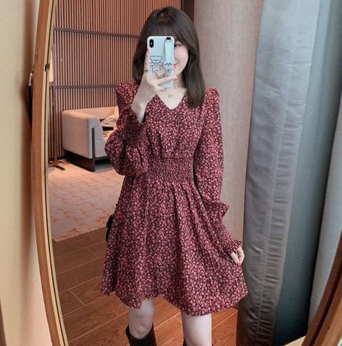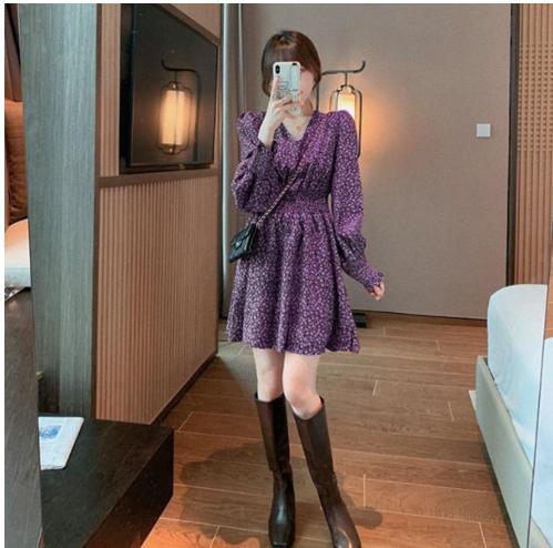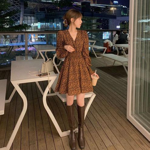 Tên sản phẩm : Váy hoa cổ chữ V khí chất mùa thu đông phong cách hàn quốc mới thiết kế váy ngắn tay dài tay dài eo cổ điển