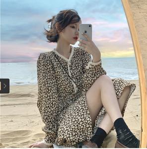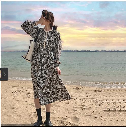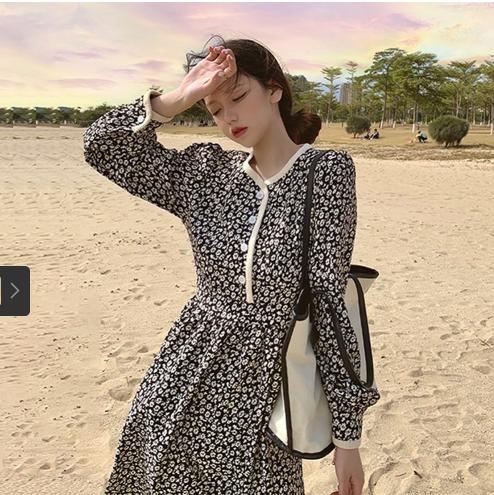• Váy hoa kiểu Pháp retro mùa thu năm 2021, phần eo mới mỏng hơn, phần chân váy phía dưới, kiểu váy chữ A dài giữa kiểu phương tây