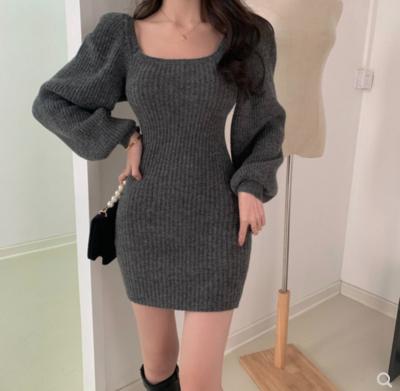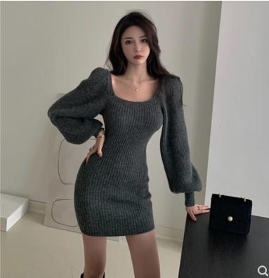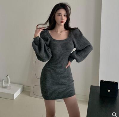 váy len dệt kim tay dài thu đông ôm body với màu xám lông chuột