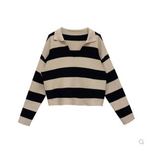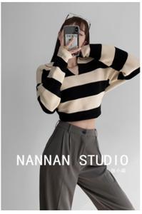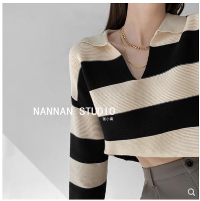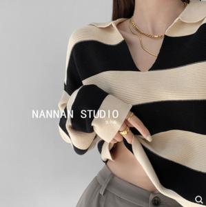 • Zhang Xiaonan NANNAN áo len sọc rộng rãi lười biếng của phụ nữ áo len dài tay giản dị mùa thu và mùa đông POLO cổ áo trên